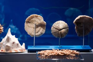 El recorrido comienza con un sector introductorio a la diversidad de formas y colores que muestran los invertebrados. Ahí también se presenta a una almeja gigante del género Tridacna cuya valva pesa más de 60 kg. Fue recuperada de la venta ilegal y despostada en la Colección de Invertebrados del Museo para ser exhibida con el objetivo de lograr conciencia sobre este delito ambiental.